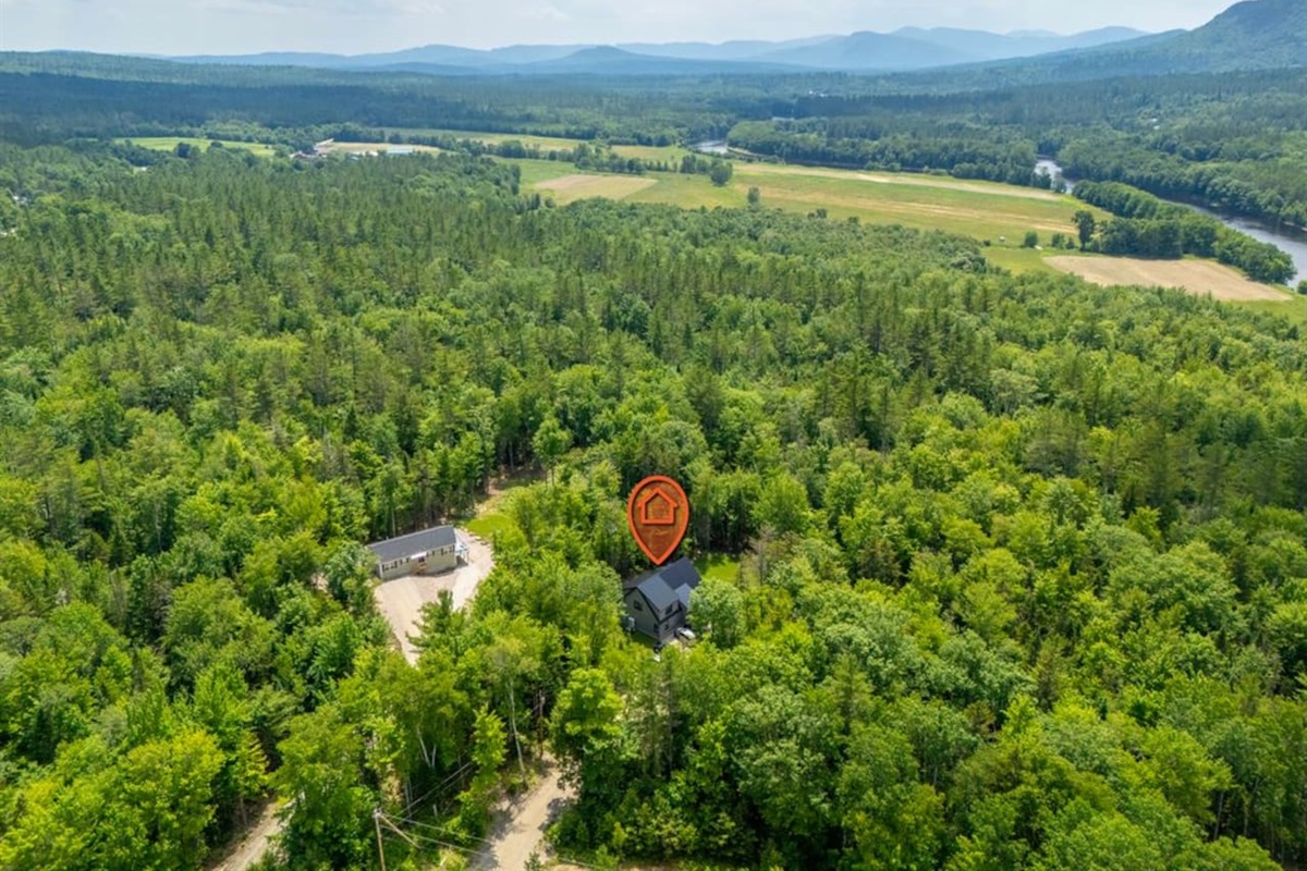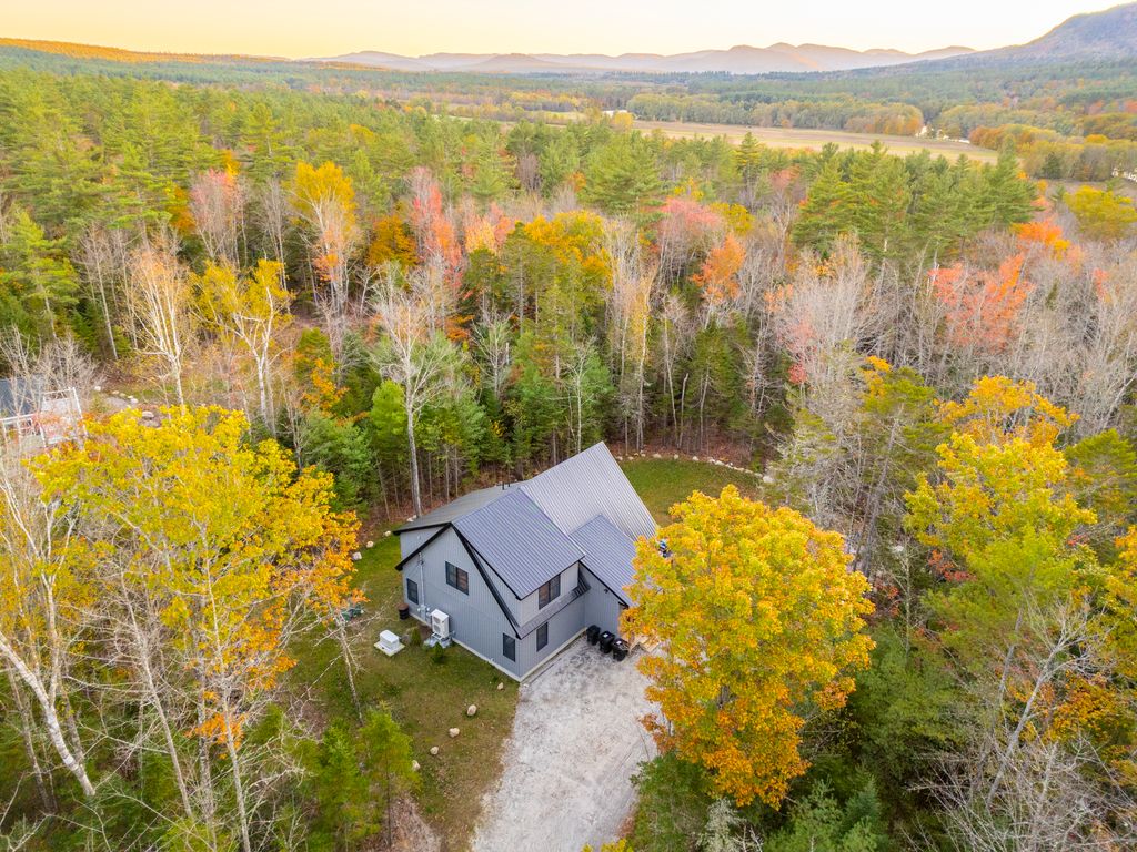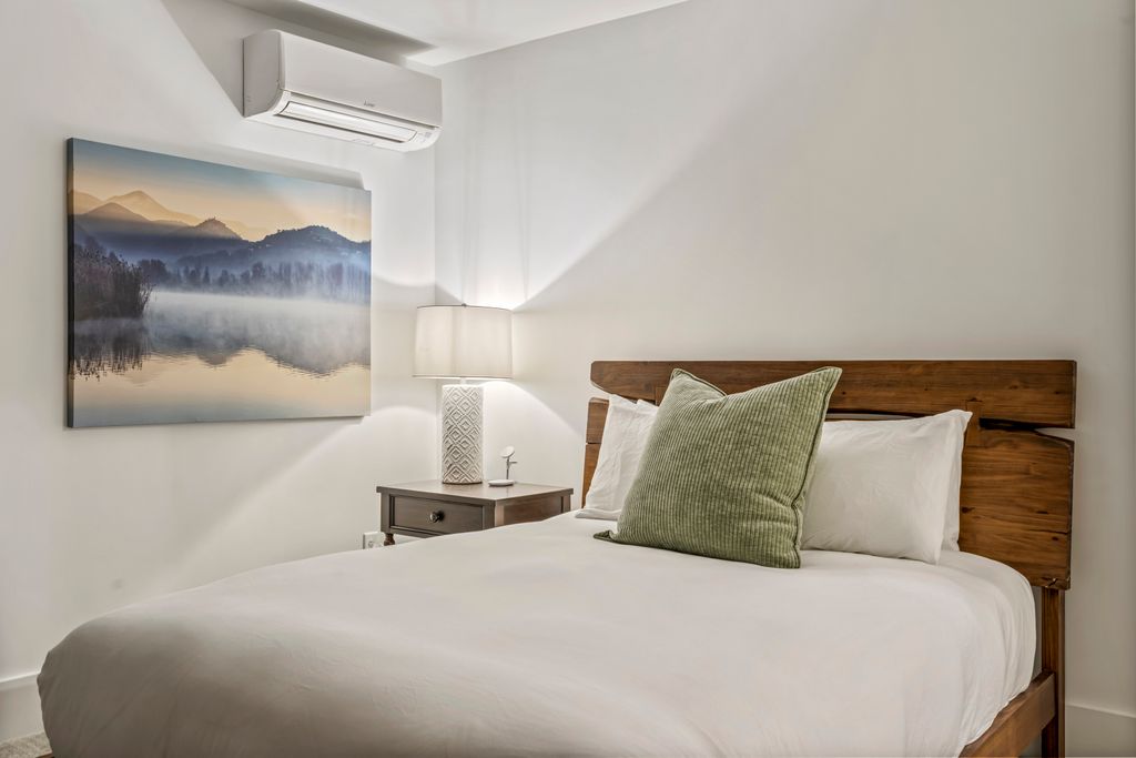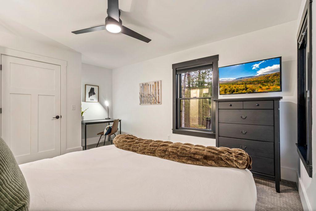 A modern mountain retreat with cozy bedding, thoughtful design, and peaceful forest views — perfect for guests seeking comfort and calm after a day exploring Bethel.